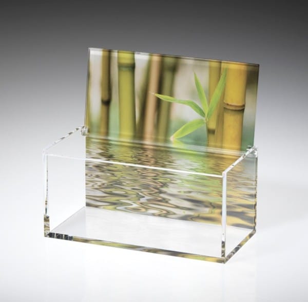 En PMMA, (plexiglass), cette matière permet une transparence proche de celle du verre ainsi que des finitions haut de gamme incomparables sur ce coffret de présentation.